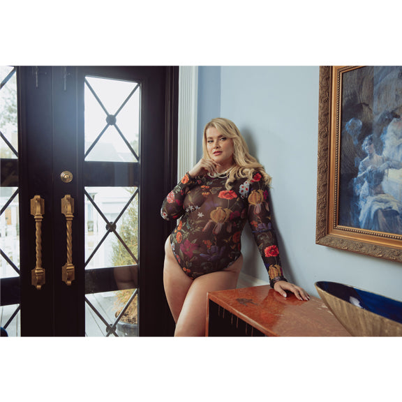 Long sleeve bodysuit with thong back and snaps at gusset. Made with super stretchy digitally printed mesh in an exclusive stunning multicolour botanical floral pattern.