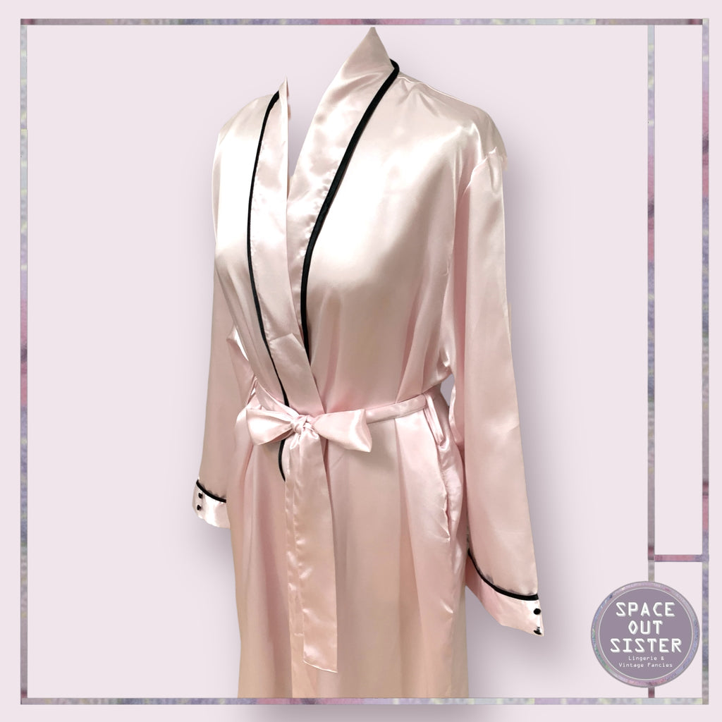 Introducing the Very AP C&A Robe - the perfect combination of luxury and style. Made with smooth satin and accented with defined black piping, this knee length robe exudes elegance. The lovely button detail on the cuffs adds a touch of sophistication.