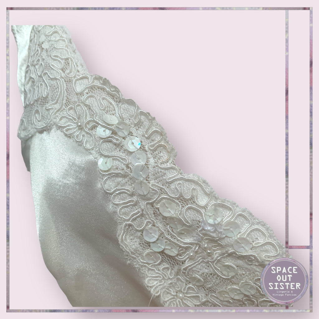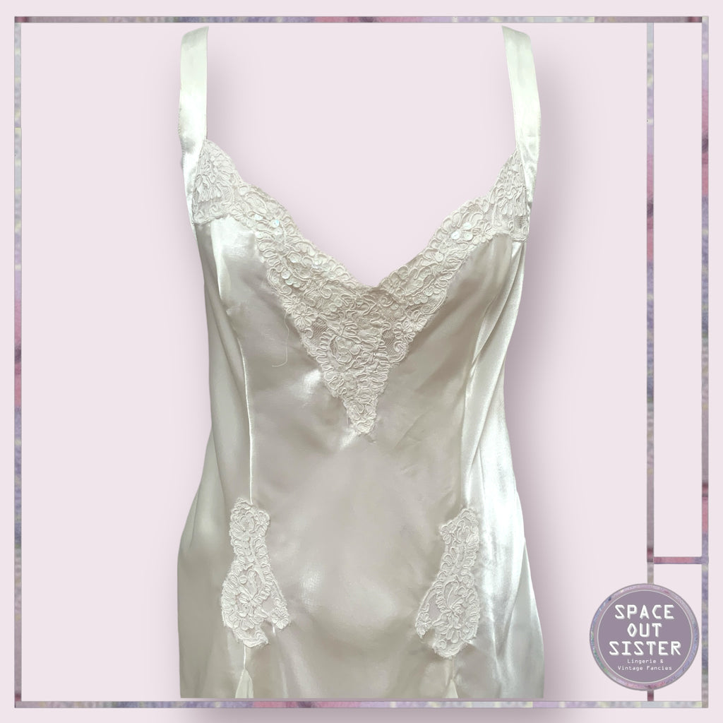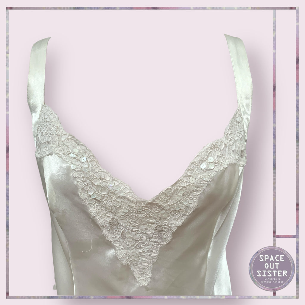 This stunning ivory Victoria's Secret Nightdress boasts chic and stylish design. Adorned with beautiful sequins along the neckline, this nightdress exudes elegance. Its wide satin straps and pretty georgette inserts on the satin skirt add a touch of luxury to the piece. Perfect for a glamorous night's sleep. As presented, please see last photos.