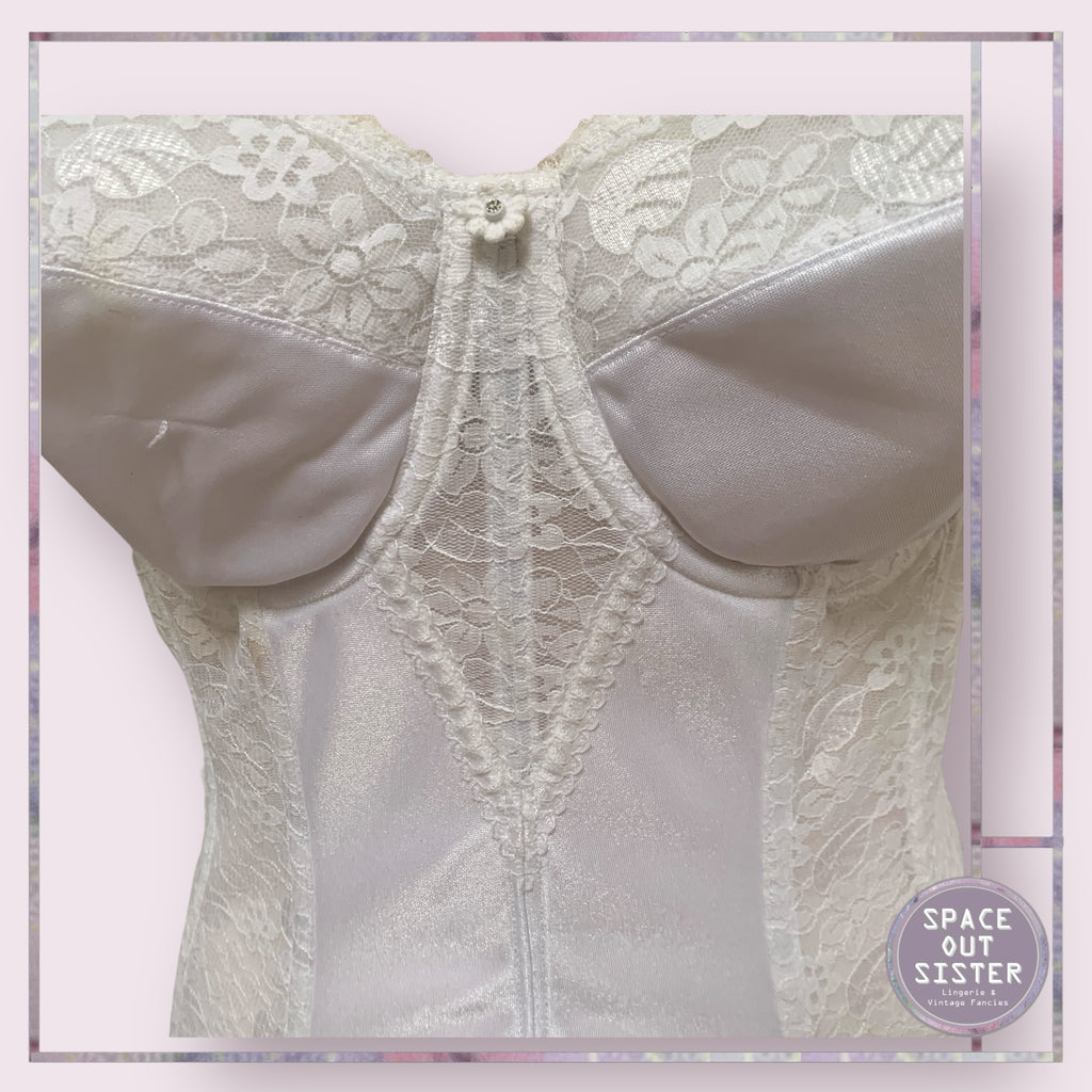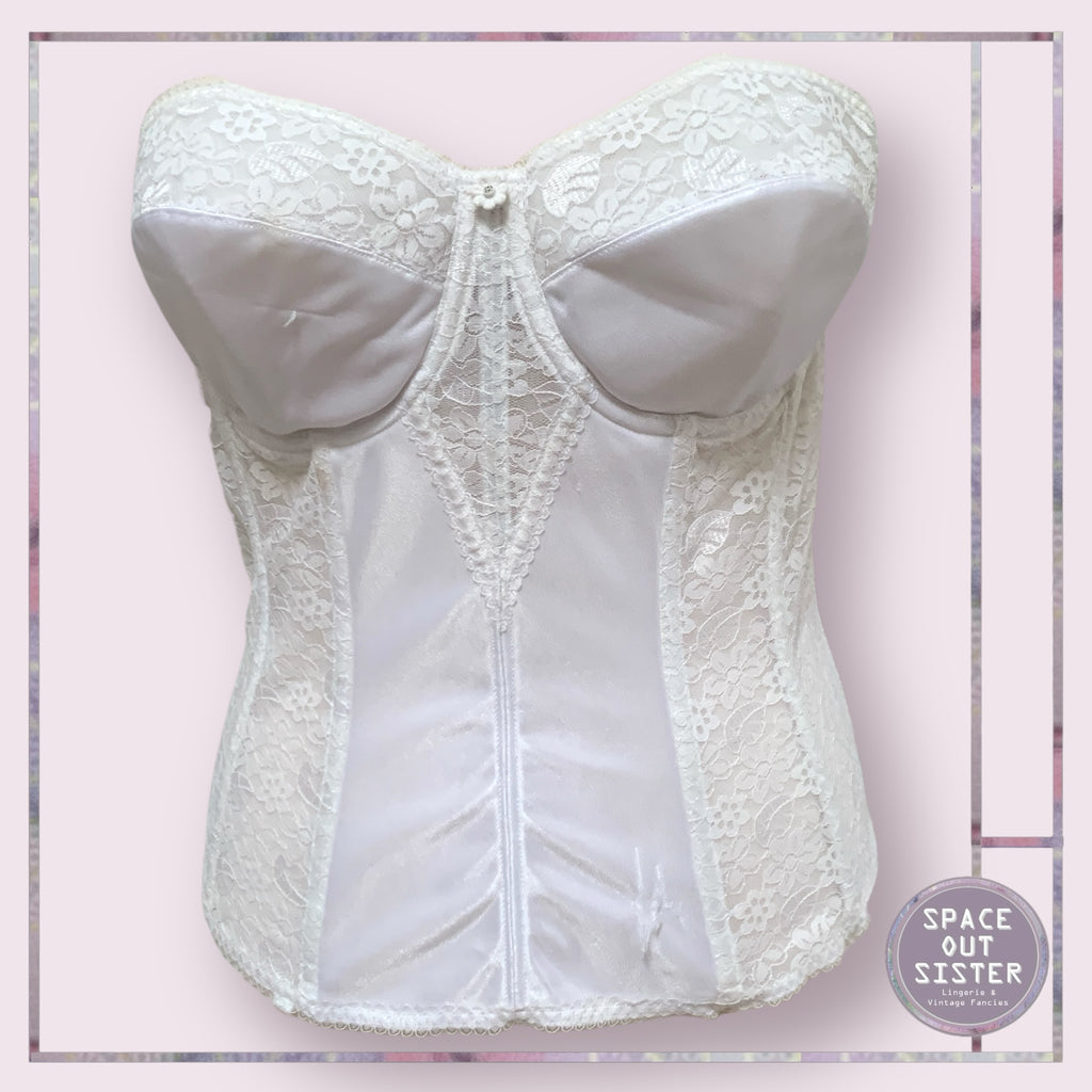 The Vintage Dominique Bustier offers a classic and elegant look with its beautiful white design and secure hook and eye closure. Whether you're dressing up for a special occasion or simply looking for a stylish undergarment, this delightful bustier is sure to provide both comfort and sophistication. As seen, please see last photos.