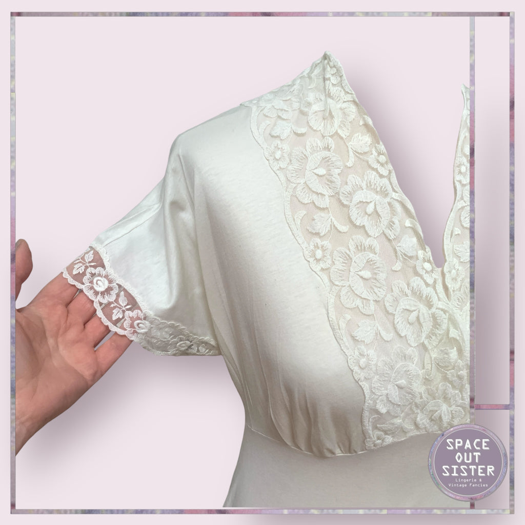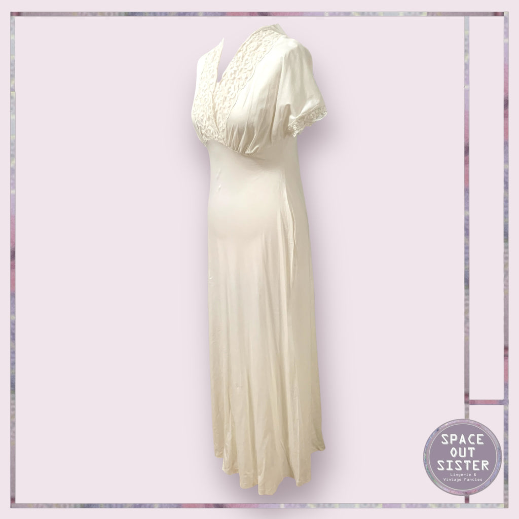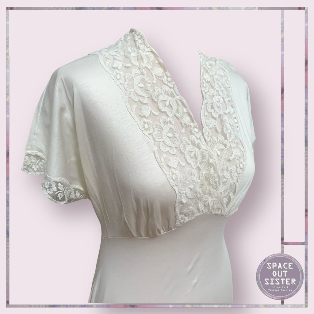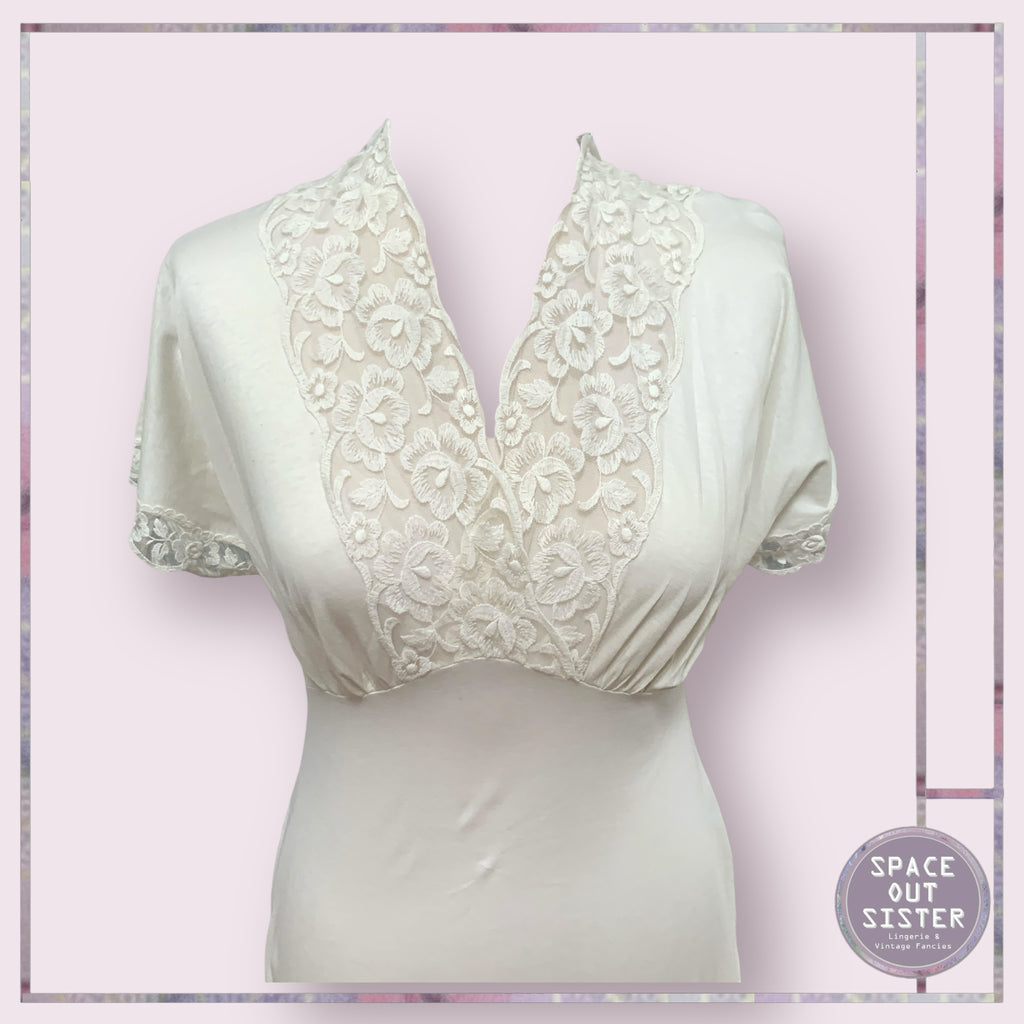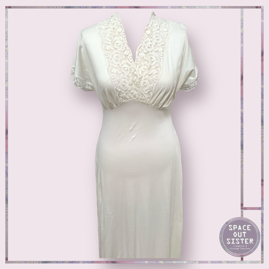 Discover the elegance of our Vintage Palmers Cotton Nightdress. Made with high-quality cotton, this buttercream nightdress features a gathered bust area and delicate lace details on the sleeves. Elegant and alluring, it is sure to make you feel stunning.