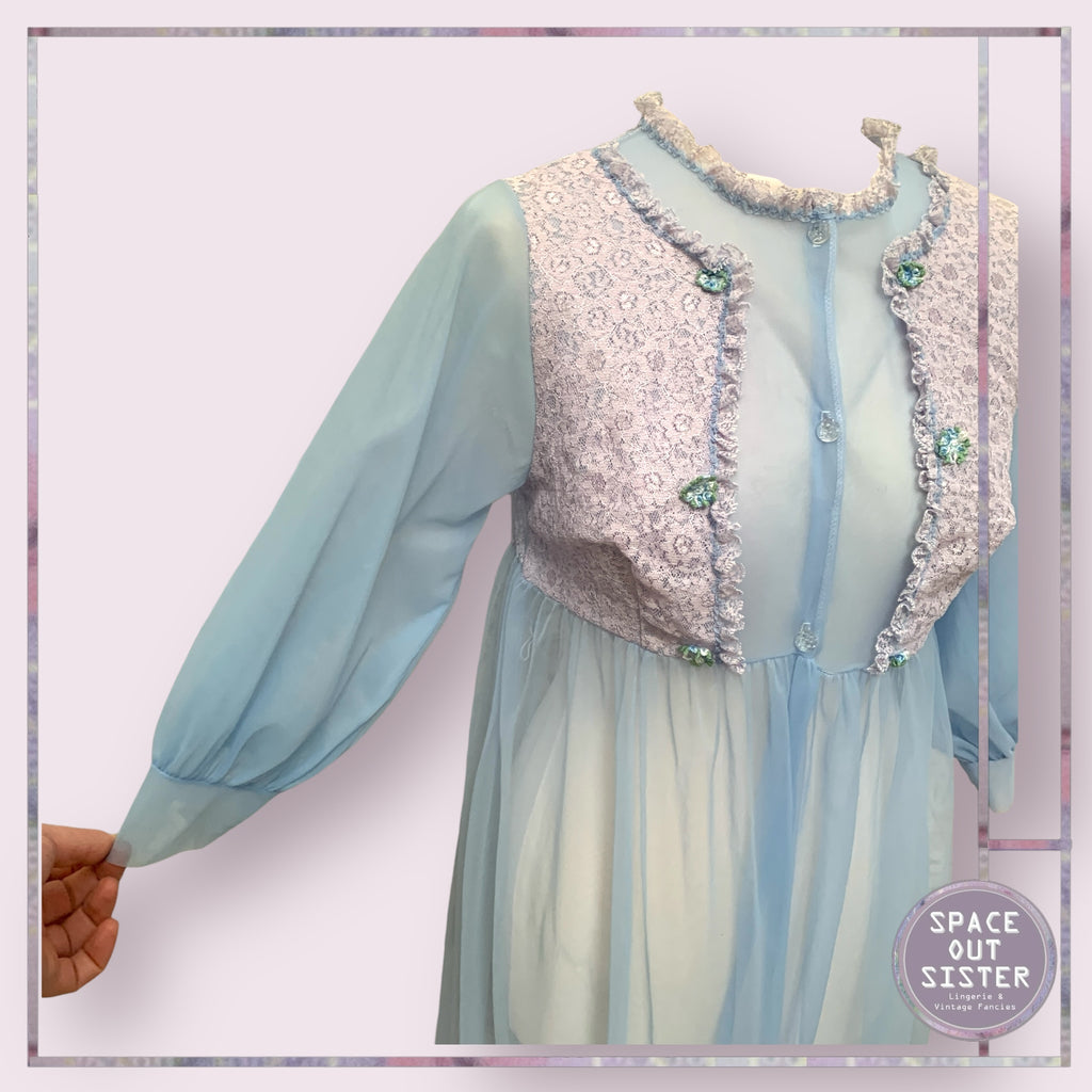 Indulge in luxury and elegance with our Vintage Pastel Blue Negligee. Crafted with stunning pastel blue fabric and delicate caramel lace at the bodice, this sheer piece exudes charm and sophistication. Fall in love with this exclusive negligee that will make you feel both beautiful and alluring.