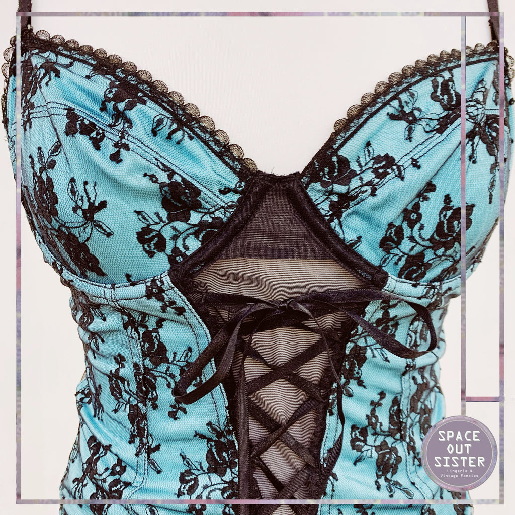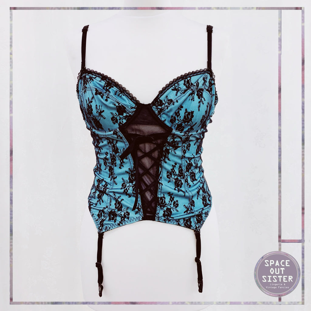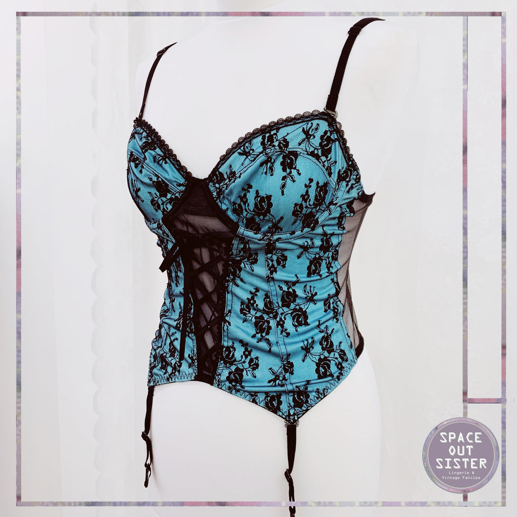 Stunning 1980s Vintage bustier in a green almost turquoise with black lace overlay. As presented, please see last photos. Really flirty and feminine piece with four garter straps. Adjustable shoulder straps.