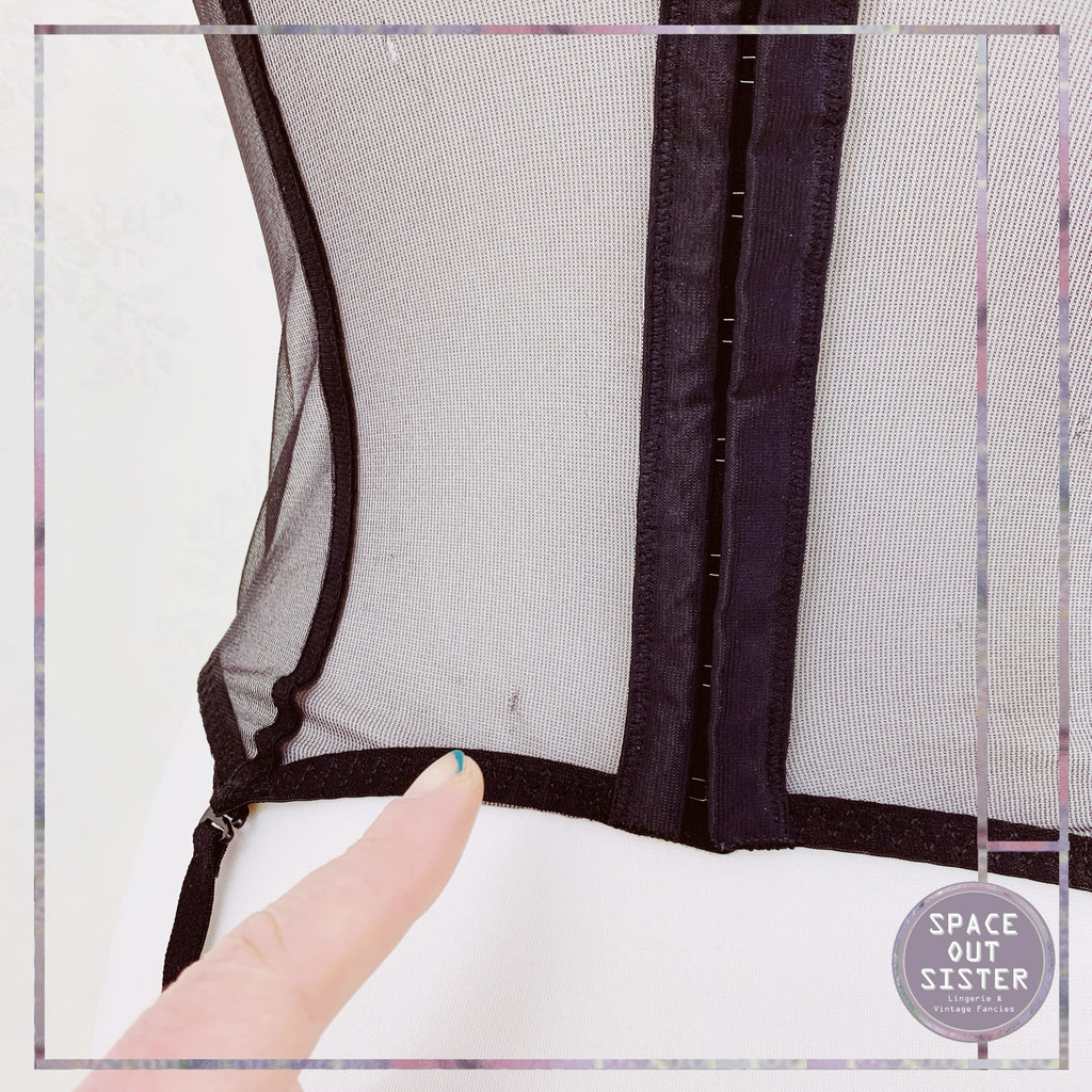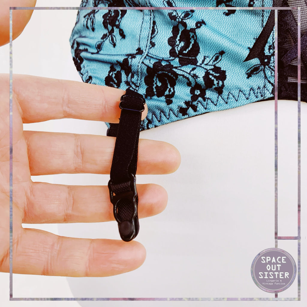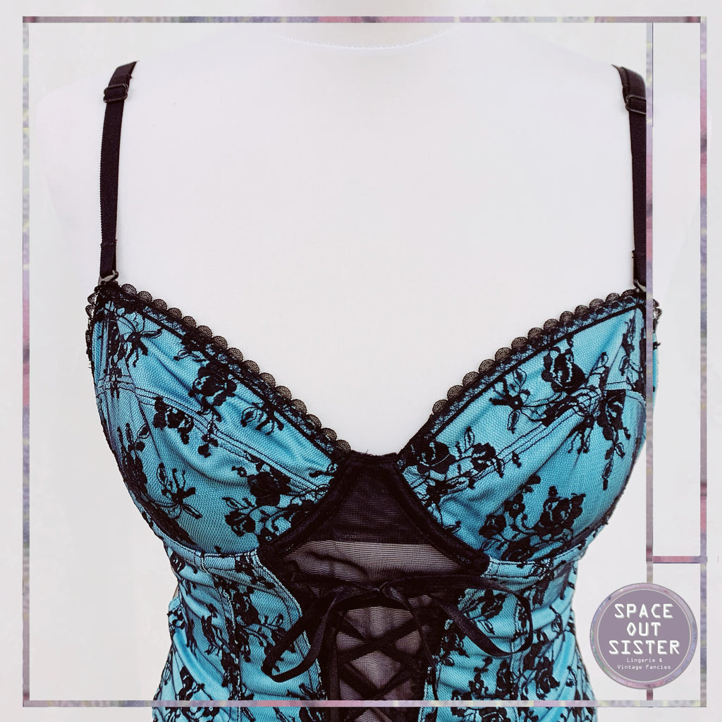 Stunning 1980s Vintage bustier in a green almost turquoise with black lace overlay. As presented, please see last photos. Really flirty and feminine piece with four garter straps. Adjustable shoulder straps.