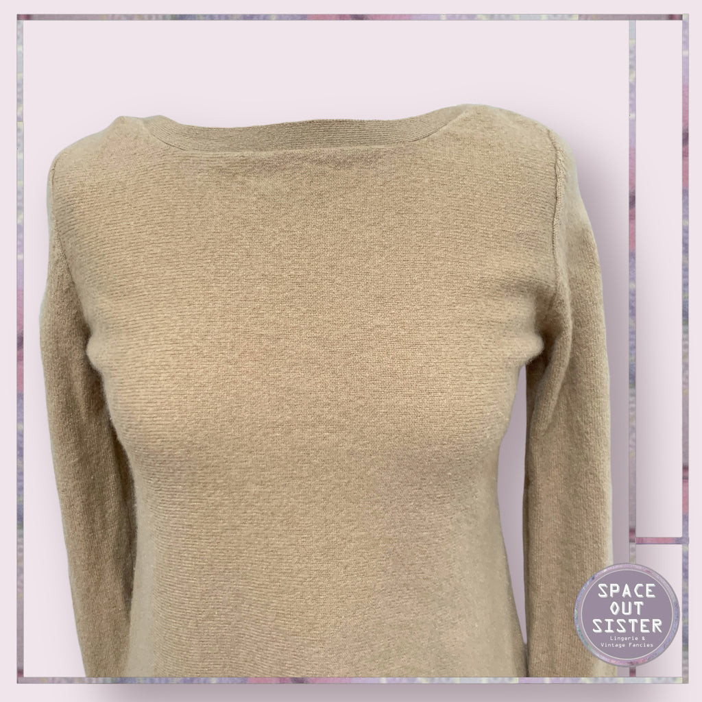 Indulge in luxurious comfort with this Pre-Loved Peck & Sand Cashmere Jumper. Crafted from gorgeous taupe cashmere, this boat neck jumper is perfect for any occasion. Experience the softness and warmth of high-quality cashmere while looking effortlessly stylish.