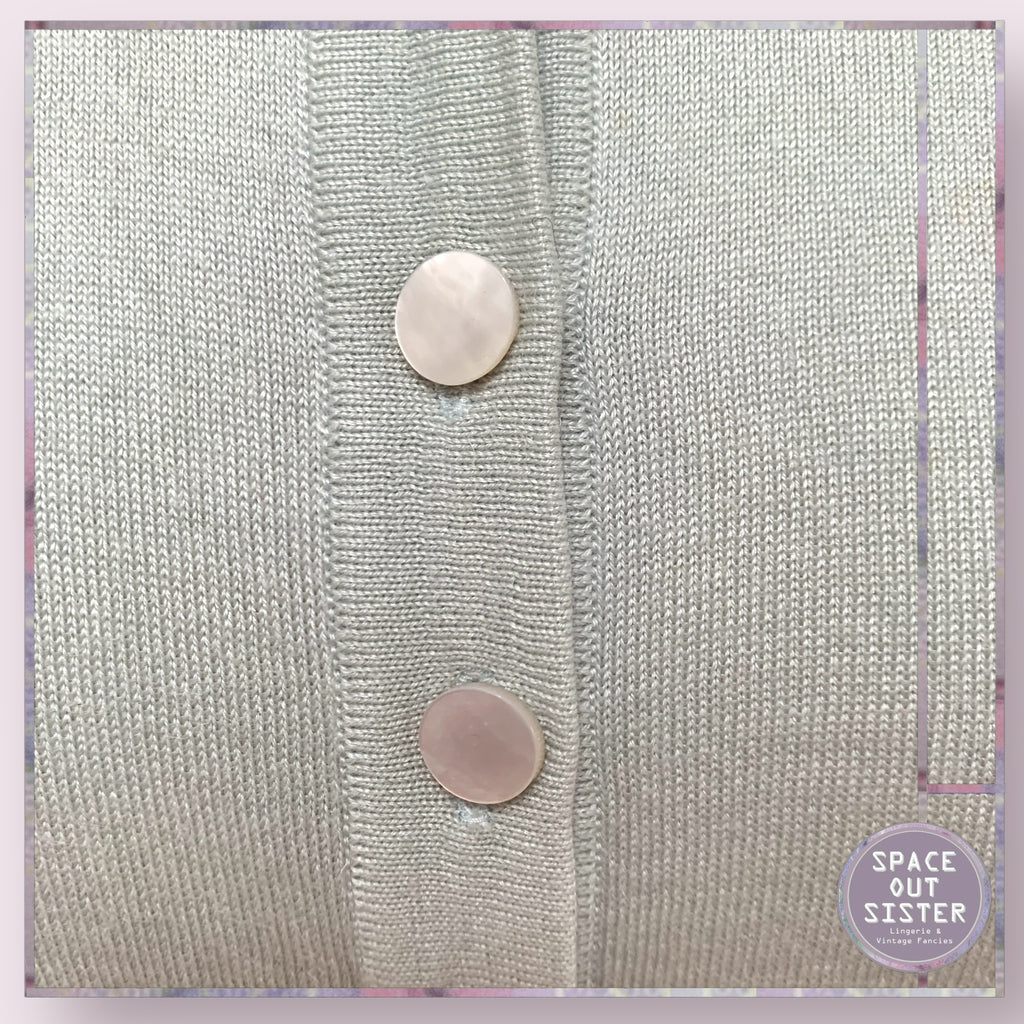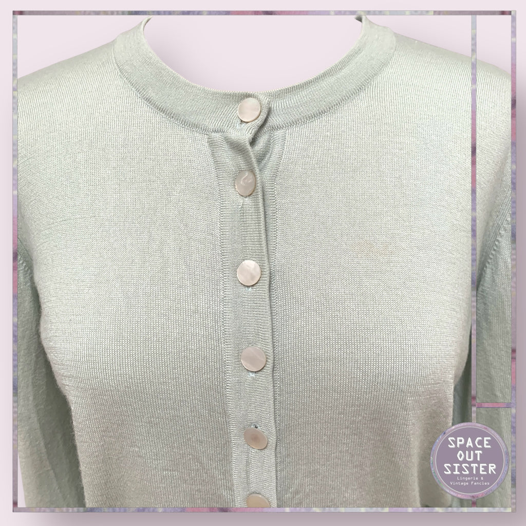 This stunning eggshell green cashmere and silk cardigan boasts an elegant design with mother of pearl buttons. Enjoy the luxurious feel and warmth of cashmere, mixed with the lightweight and breathable properties of silk. Elevate your wardrobe with this pre-loved piece. as Presented, minor blemishes on one sleeve and one bust area. Please see last photos.