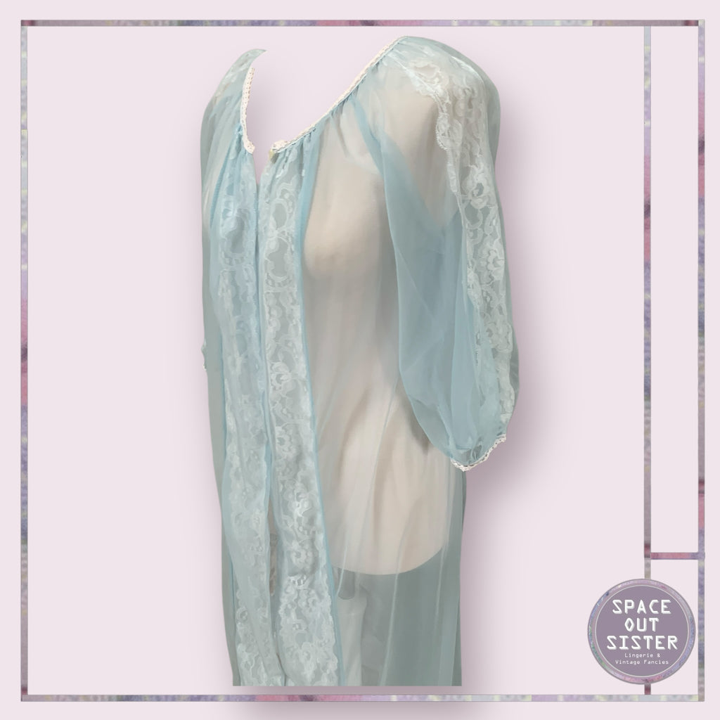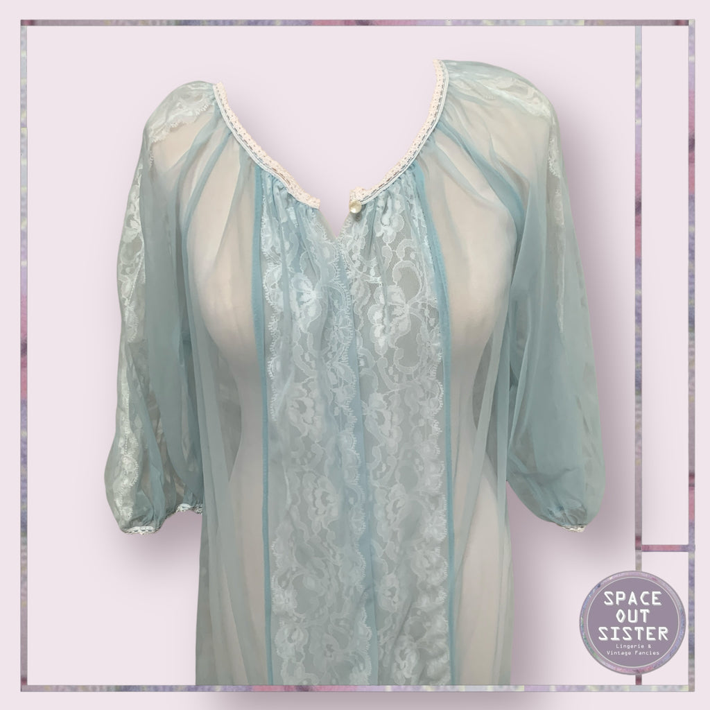 This beautiful negligee features a stunning vintage powder blue color and a full length design. Made for those looking to experience a romantic and floaty feel, it is perfect for any special occasion or a relaxing night at home.