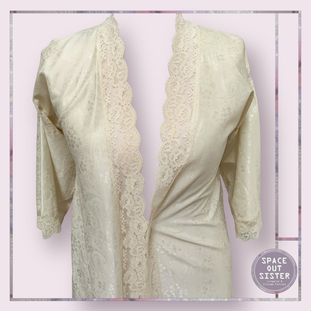 Indulge in luxury with our Vintage Creama Robe. Featuring a timeless design and crafted from elegantly embossed satin, this robe exudes beauty and sophistication. Please note, the belt is missing.