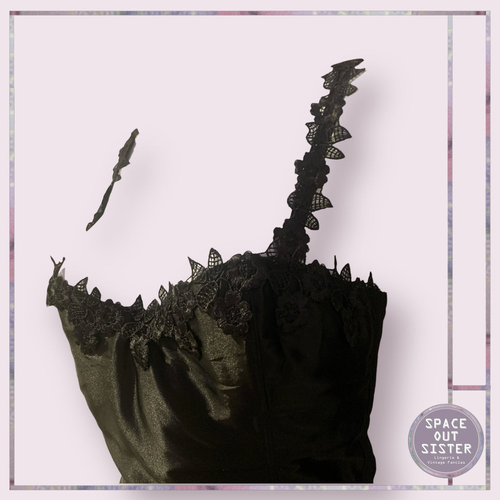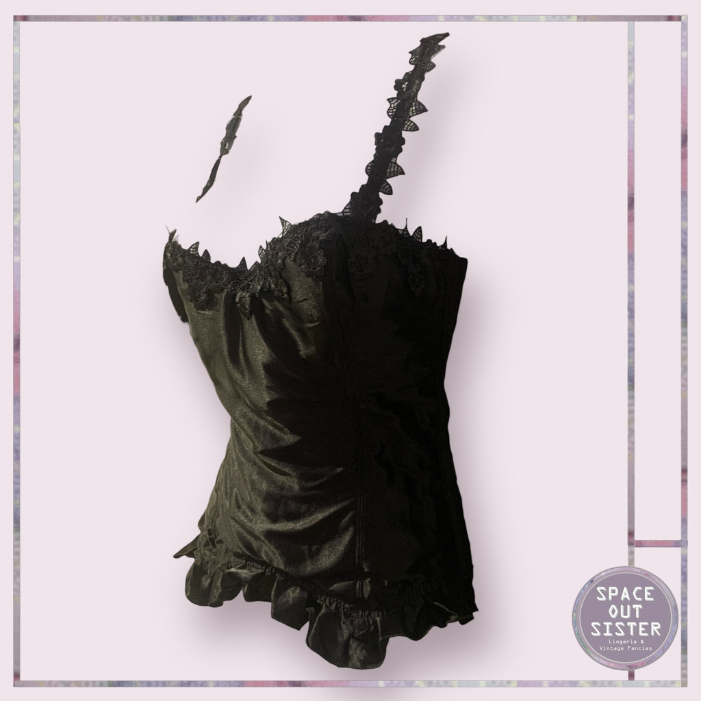 Expertly crafted from vintage black satin, this exquisite bustier is the perfect addition to any wardrobe. Its delicate Guipure lace detailing adds a touch of elegance, while the hook and eye fastening and adjustable straps ensure a comfortable and secure fit. Versatile enough to wear as outerwear.
