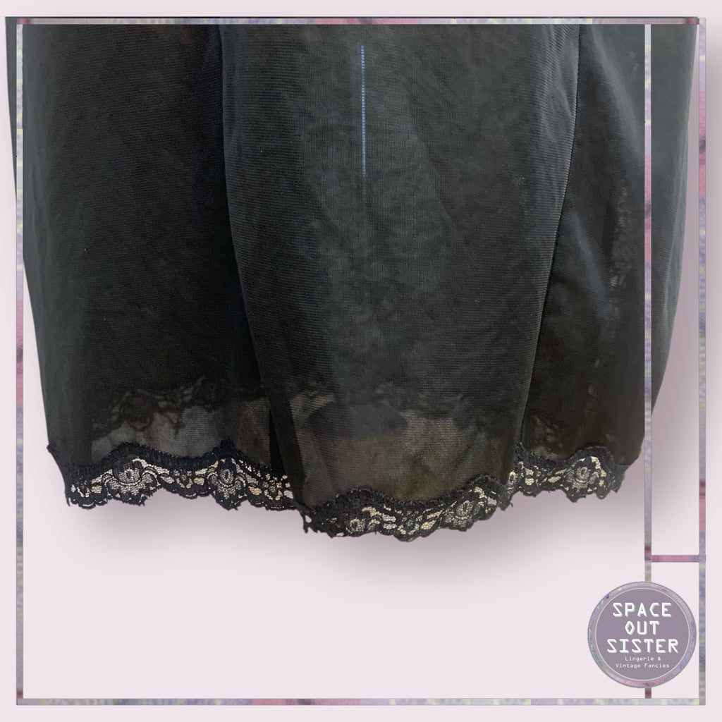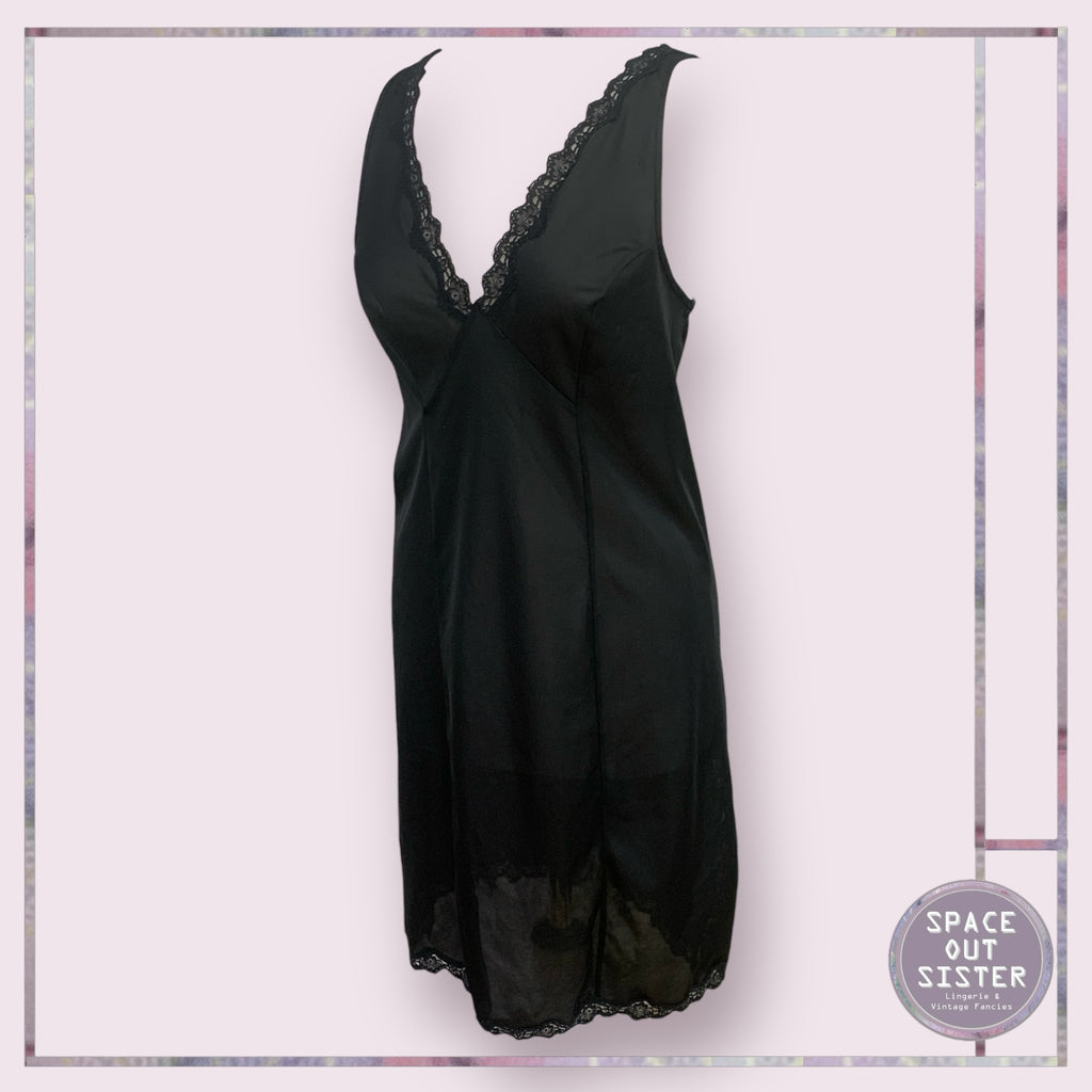Expertly crafted in a timeless black hue, this vintage slip boasts a plunging V-neckline and knee-length cut. With its elegant design, it effortlessly exudes confidence and femininity.