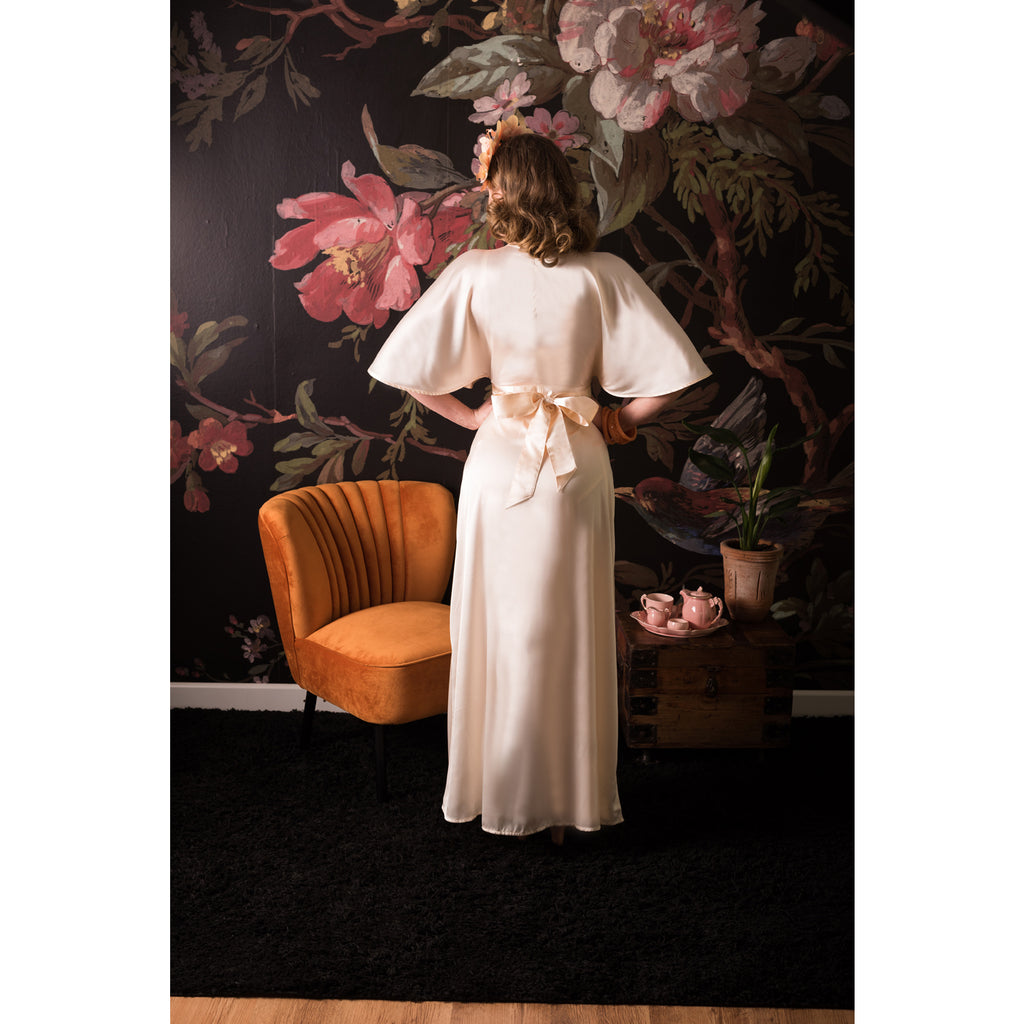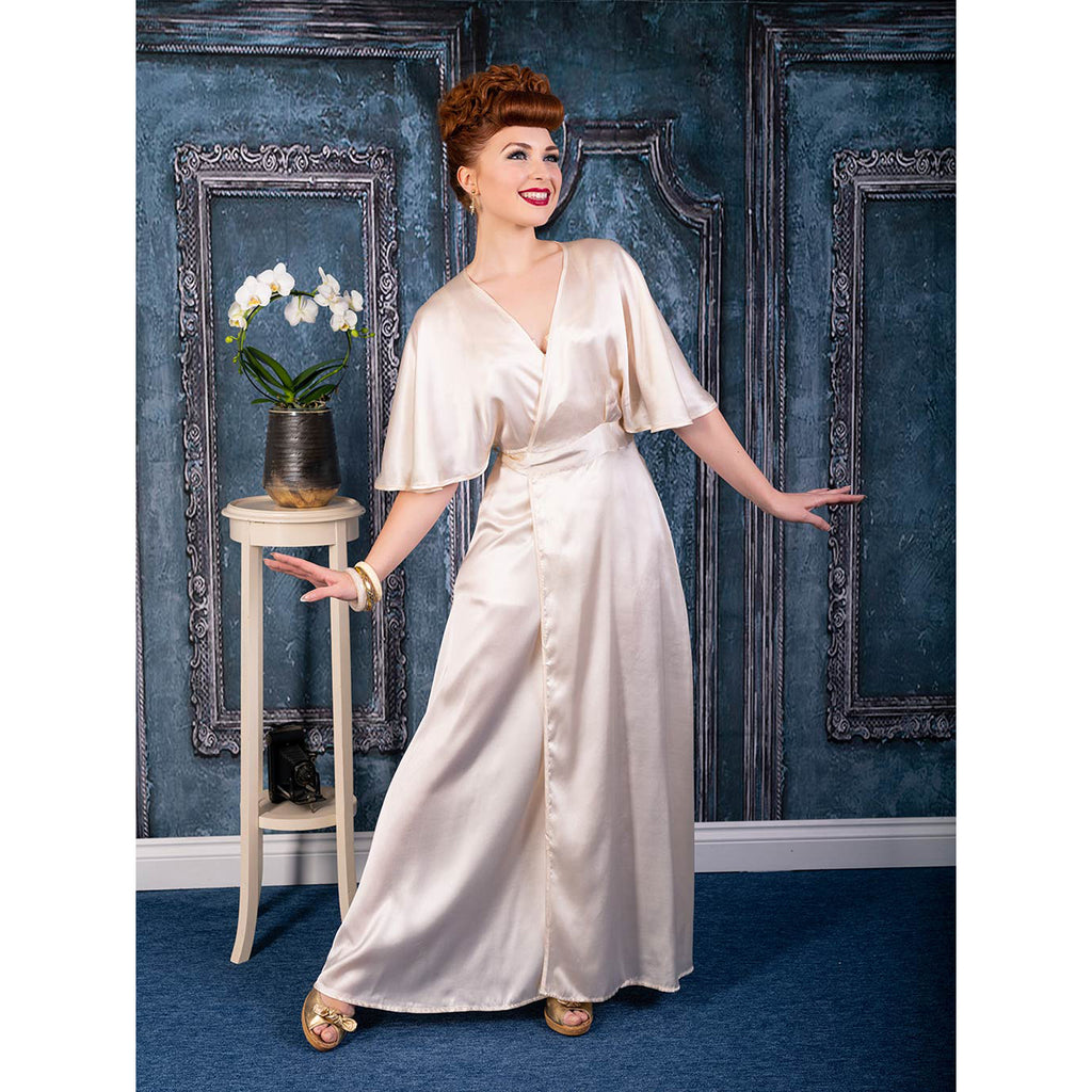 The wrap style, tied in a satin bow at the back, emphasises your curves while the 1930s style butterfly sleeves are an alluring true vintage feature.