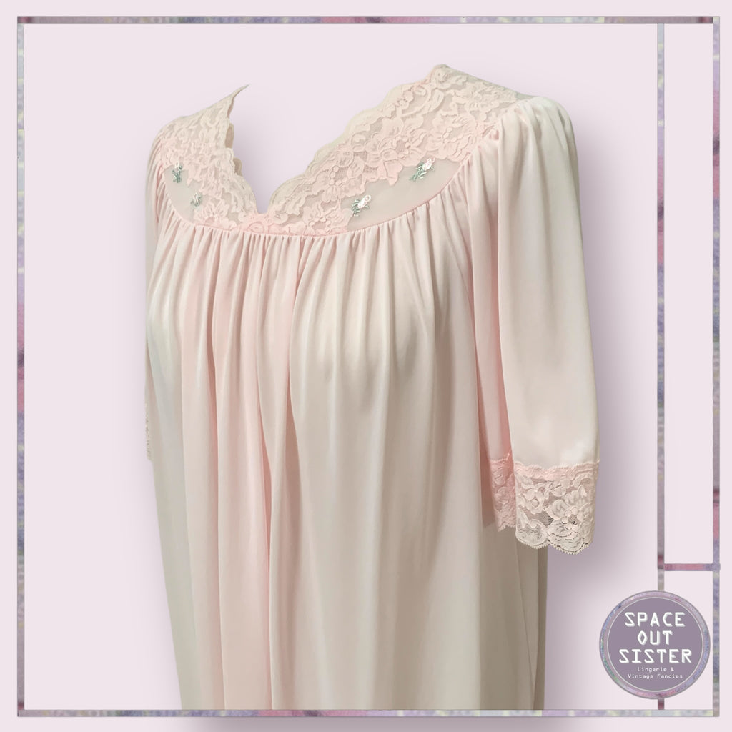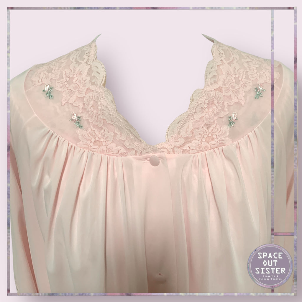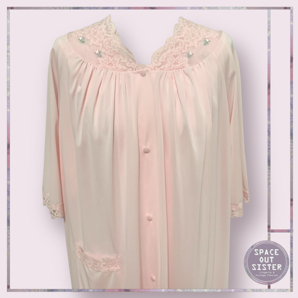 Indulge in the luxurious charm of our Vintage Shadowline Set. This exquisite nightdress and matching robe feature a soft pastel pink round neckline, and the robe even includes an exterior pocket. The perfect combination of nostalgia and elegance, this set is sure to add a touch of sophistication to your sleepwear collection.