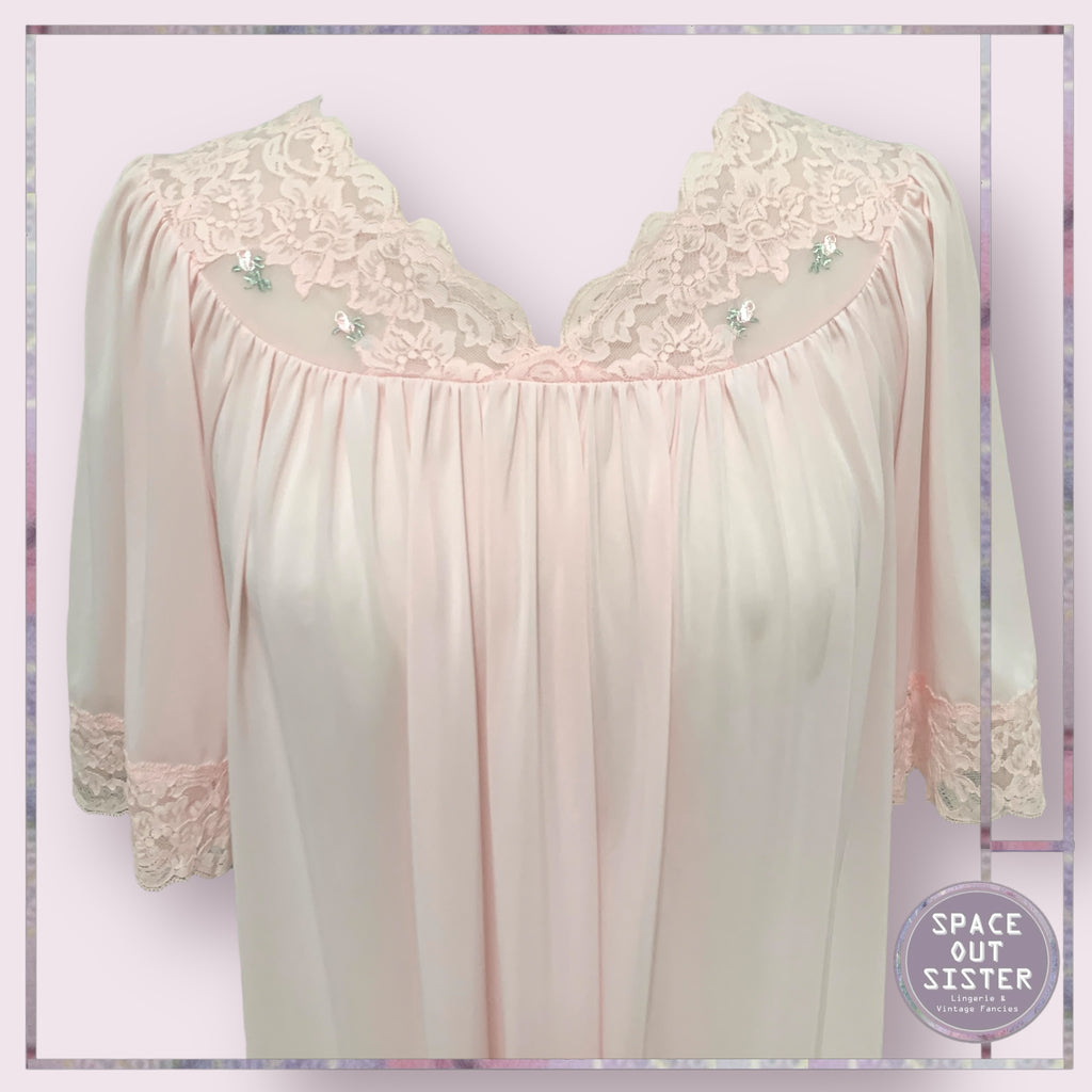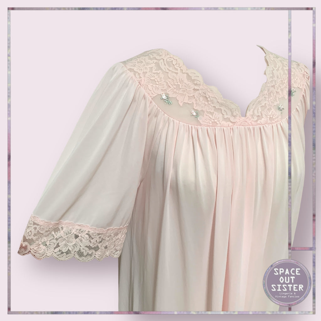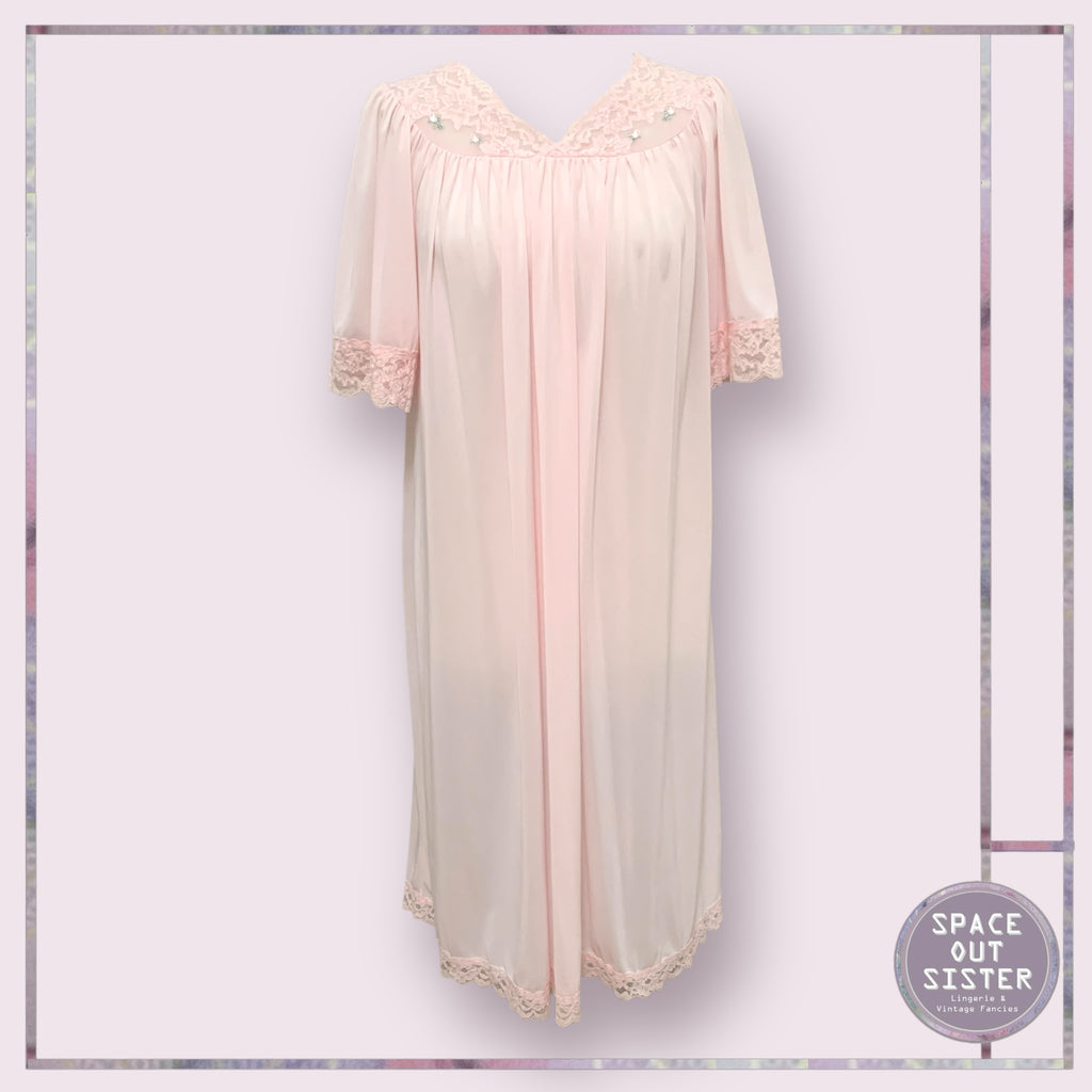 Indulge in the luxurious charm of our Vintage Shadowline Set. This exquisite nightdress and matching robe feature a soft pastel pink round neckline, and the robe even includes an exterior pocket. The perfect combination of nostalgia and elegance, this set is sure to add a touch of sophistication to your sleepwear collection.