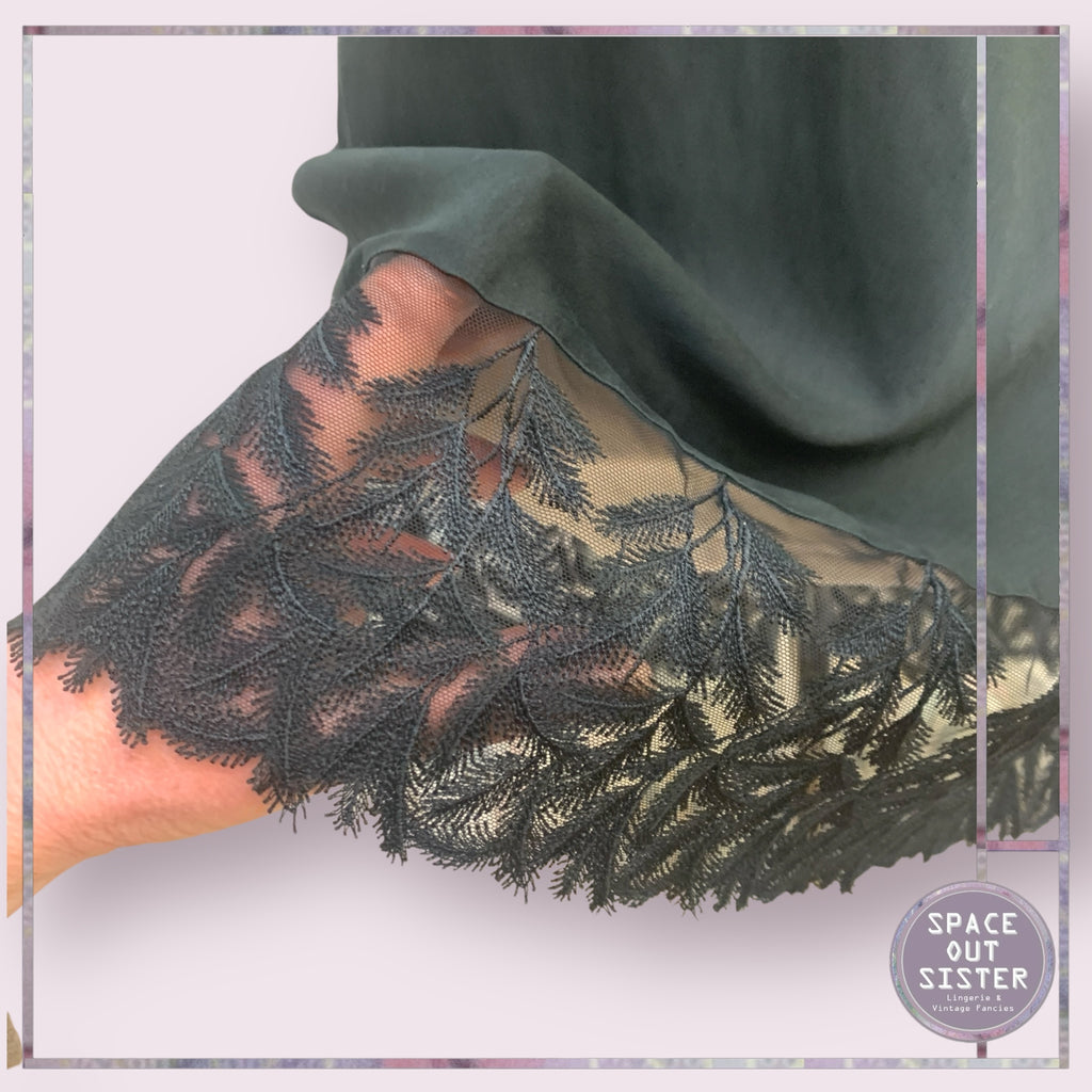 Slip into something a little more... fabulous! Our Vintage Black Silk Nightdress is the ultimate in nighttime luxury—think of it as a cozy hug from a fancy cloud. The ornate lace hemline? It's like icing on a cake. Please note, there is a repair on the hemline.