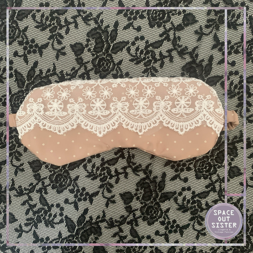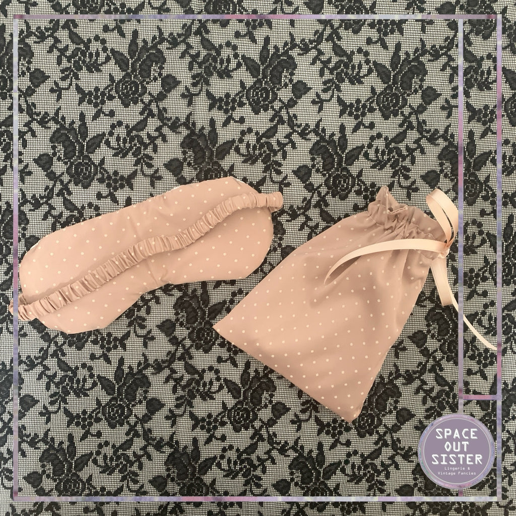Handmade Satin Polka Sleep Mask & Matching Pouch in taupe with lace detail. Lined with bamboo cotton. Helping you have a most restful & peaceful sleep time.