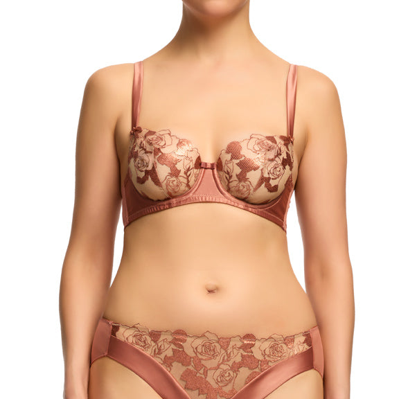 Rosabelle bra in copper is underwired, sheer cup embroidered bra with dramatic detailing. A sheer support sling in the bra cup ensures lift and shape without bulk. Satin straps and ribbon trims.