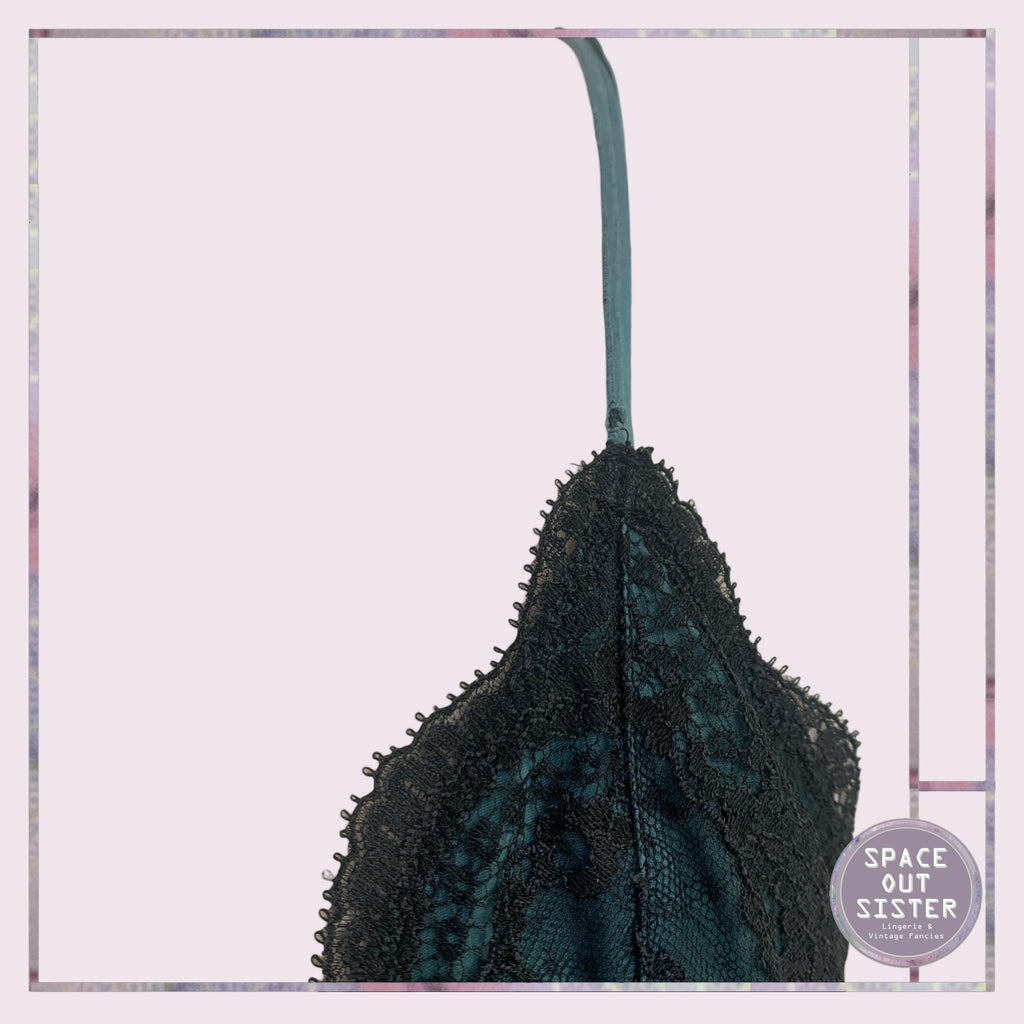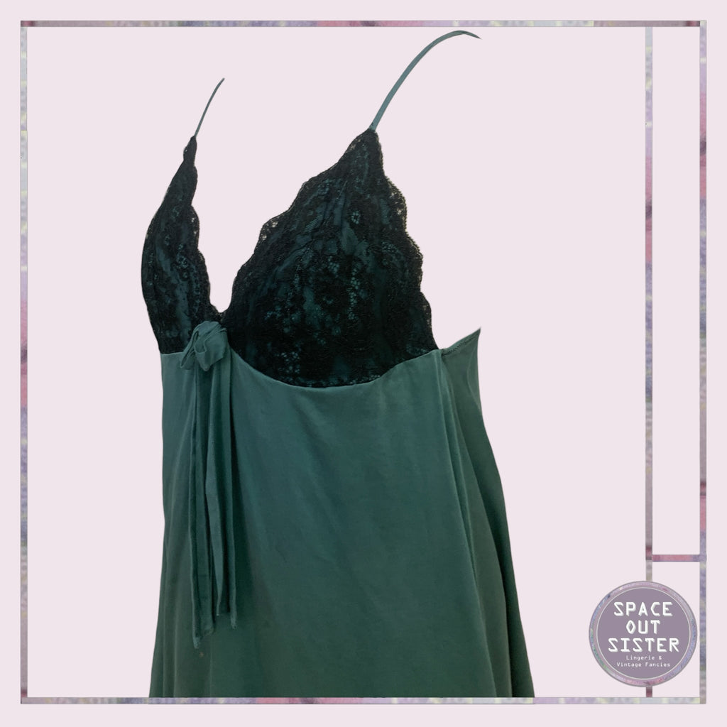 Experience luxury and elegance with the Pre-Loved Myla Silk Nightdress. Crafted with soft forest green silk and delicate spaghetti straps, this nightdress exudes comfort and sophistication. The black lace overlay on the bust adds a touch of glamour. Sleep in style and pamper yourself with this beautiful piece from Myla. As seen, some evidence of wear on each strap.