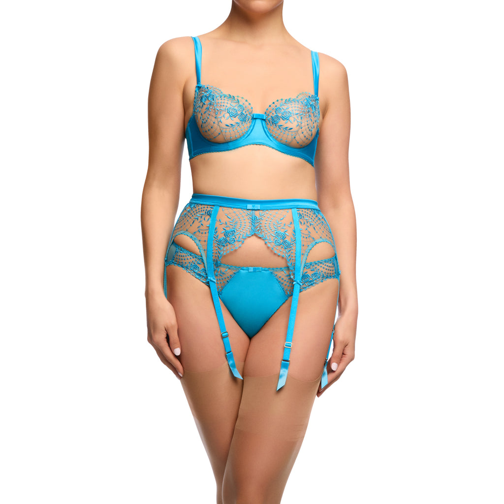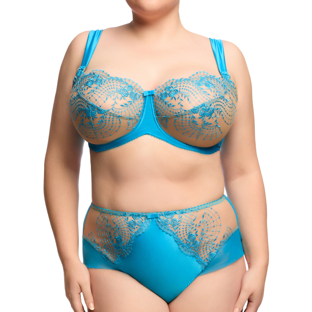 Julie's Roses is created by Dita to honour her friend Julie Newmar, the original Cat Woman. Julie has a wonderful rose garden and her roses are an inspiration to this collection. The Julie's Roses Full Figure Underwire bra has sheer rose embroidered cups, inner support from the concealed tulle sling with further support from the wide satin straps. A beautiful bra for Dita's curvy customers.